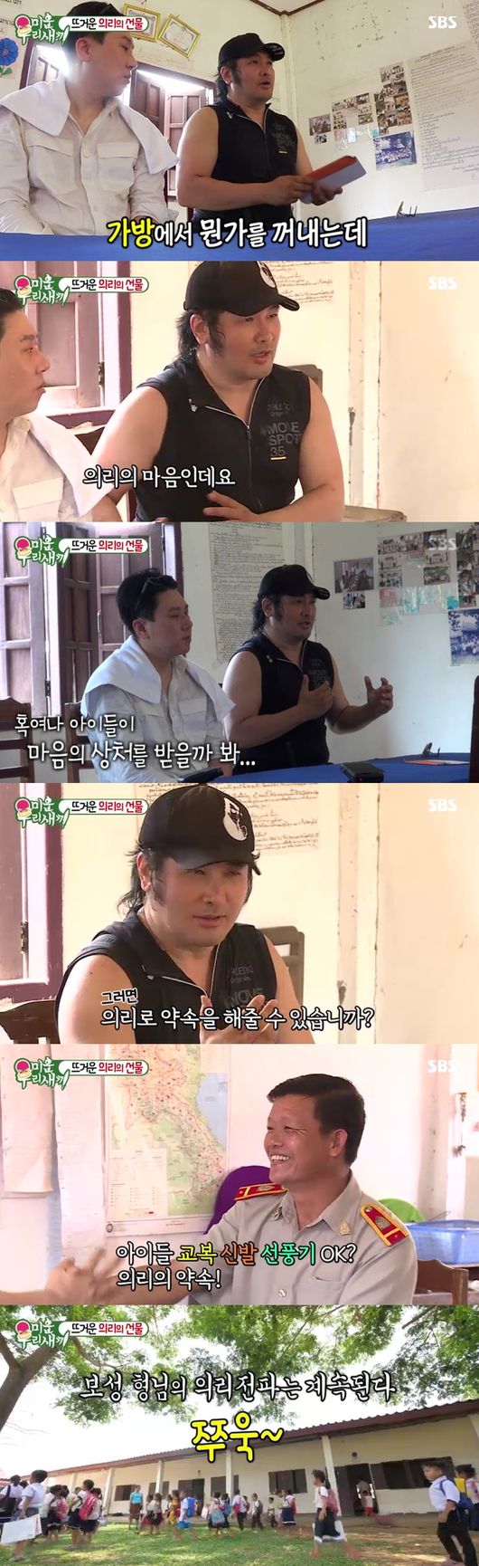 이어 김보성은 학교 교장을 찾아가 "교복을 못 입은 아이들 있더라"라면서 가정형편이 어려워 신발과 교복이 없는 아이들을 위해 장학금을 전달하며 따뜻한 마음을 전했다.