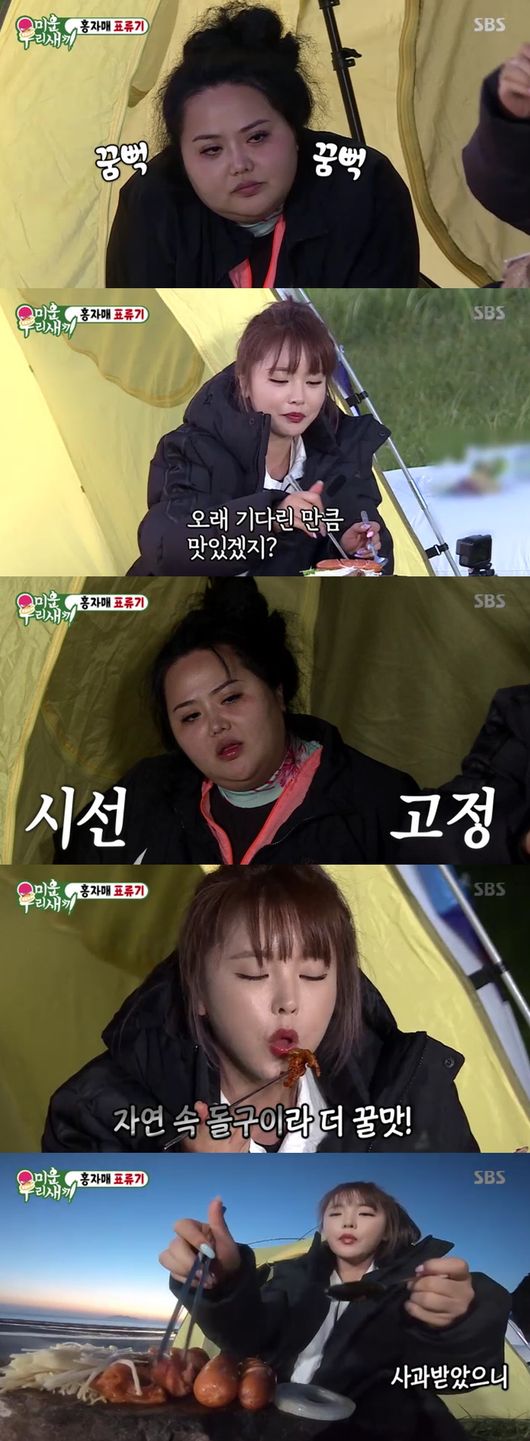 예상외로 음식이 구워지자 홍진영은 뿌듯해했다. 이어 하나씩 음식을 구워먹기 시작하자, 홍선영은 텐트 밖에서 나오더니 "살살 녹지 않냐"며 궁금, 친절한 말투로 묻더니 바로 음식으로 시선을 고정해 폭소하게 했다. 결국 홍선영은 "한 입만"을 호소,홍진영은 "미안하지만 안 된다"며 거절했다. 홍선영이 "먹는걸로 추잡하게 그러지 마라"고 하자, 홍진영은 "앞으로 나 무시하지 마라"고 말하며 음식을 나눠먹었다. 자연 속 돌구이 맛에 흠뻑 빠진 두 사람은 "역대급"이라 말하며 계속해서 먹방에 빠졌다.