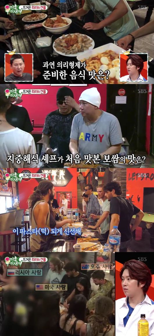 이상민은 수육과 김치찜, 그리고 떡볶이를 완성, 궁셔리 셰프답게 능숙하게 요리를 만들어냈다. 외국인들은 두 사람의 요리를 보더니 "식감이 상상이 안 간다, 한국음식 먹어본 적 없다"면서 의리형제가 준비한 음식을 맛 봤다. 본격적으로 음식을 맛 본 외국인들은 "맛있다"며 엄지을 세웠다. 떡볶이는 인기폭발할 정도였다.