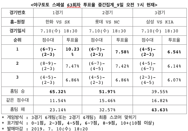 체육진흥투표권 스포츠토토의 수탁사업자인 ㈜케이토토는 10일(수)에 열리는 2019시즌 한국프로야구(KBO)프로야구 3경기를 대상으로 한 야구토토 스페셜 63회차 투표율을 중간 집계한 결과, 참가자의 43.63%가 삼성-KIA(3경기)전에서 원정팀 KIA의 근소한 우세를 전망했다고 밝혔다.