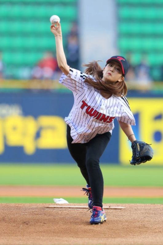 스파이크까지 신고 완벽한 '개념 시구'를 선보였다. 홈플레이트까지 18.44m 거리인 마운드의 투구판을 밟고 던져 지켜보던 팬들을 깜짝 놀래켰다. 보통 여성 연예인 시구자들이 마운드 한참 앞쪽 잔디에서 던지는 것과 달랐다.