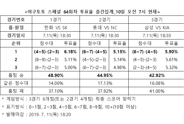 이번 야구토토 스페셜 64회차 게임은 경기 시작 10분 전인 오는 11일 오후 6시 20분 발매가 마감되며, 경기가 모두 종료된 후에 적중결과가 공식 발표된다.