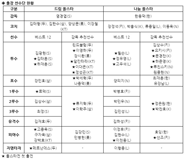 나눔 올스타 한화 한용덕 감독은 최재훈, 정은원, 호잉(이상 한화), 김상수, 요키시, 샌즈(이상 키움), 문경찬, 하준영, 박찬호(이상 KIA), 유강남(LG), 루친스키, 원종현(이상 NC)을 선발했다.