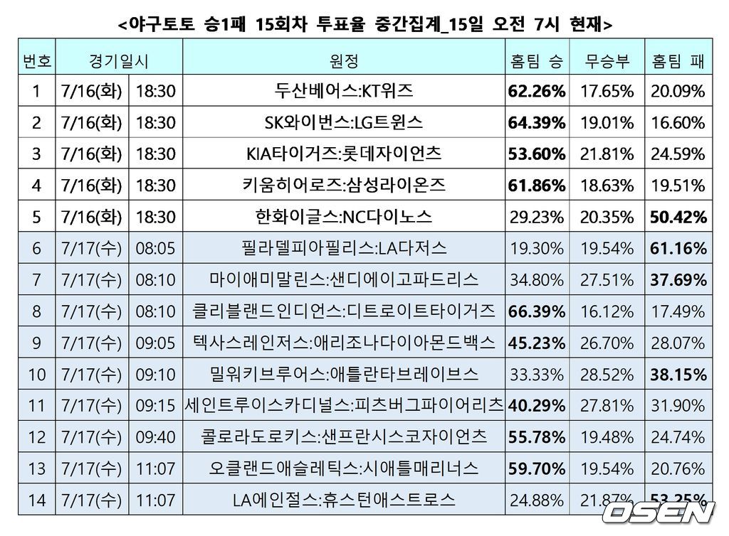 국내외 프로야구 14경기 대상 야구토토 승1패 15회차 투표율 중간집계 결과