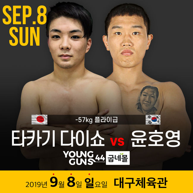 윤호영은 9월 8일 대구체육관에서 열리는 굽네몰 ROAD FC YOUNG GUNS 44에 출전, 일본의 타카기 다이쇼(18, BURST)와 대결한다.