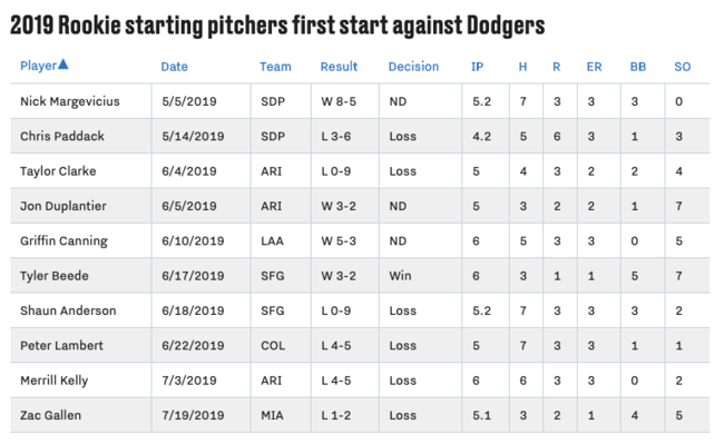 다저스를 상대한 신인 선발들 11명 중에서 타일러 비디(샌프란시스코)만이 6이닝 7탈삼진 5볼넷 1실점으로 승리 투수가 됐다. 당시 샌프란시스코의 3-2 승리. 지난해 SK에서 뛰다 메이저리그로 진출한 메릴 켈리(애리조나)는 7월 4일 다저스 상대로 선발로 나와 6이닝 3실점 QS를 했지만 패전 투수가 된 바 있다.