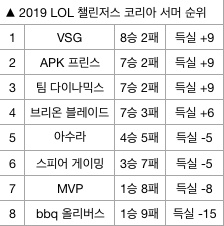 이로써 VSG는 6연승과 함께 APK, 팀 다이나믹스를 제치고 2019 서머 스플릿 첫 1위(8승 2패 득실 +9) 자리에 앉게 됐다. bbq는 7위 MVP와 1계단 더 벌어지면서(1승 9패, 득실 -15) 강등전 탈출을 위해 남은 경기 3승 이상 거둬야 하는 숙제를 떠안게 됐다.