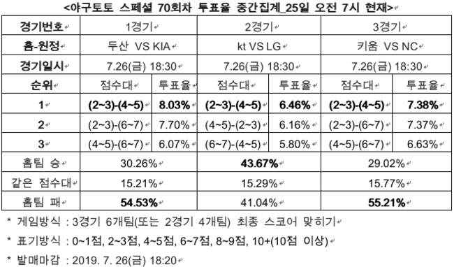 체육진흥투표권 스포츠토토의 수탁사업자인 ㈜케이토토는 26일(금)에 열리는 2019시즌 한국프로야구(KBO)프로야구 3경기를 대상으로 한 야구토토 스페셜 70회차 투표율을 중간 집계한 결과, kt-LG(1경기)전에서 승부를 알 수 없는 접전이 예고됐다고 밝혔다.