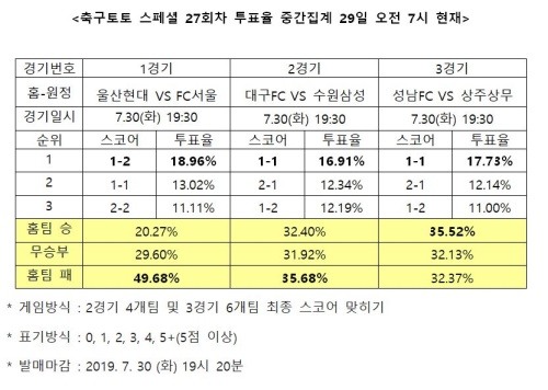 K리그 3경기 대상 축구토토 스페셜 27회차 투표율 중간집계
