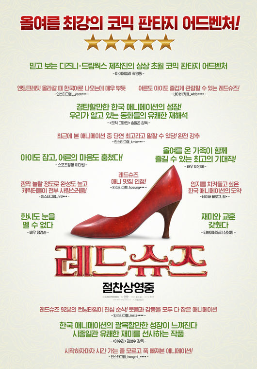 국내 언론과 실 관람객들의 강력 추천이 담긴 리뷰 포스터를 공개하며 아직 영화를 보지 못한 관객들의 발걸음을 재촉하고 있는 영화 '레드슈즈'는 빨간 구두를 신고 180도 변해버린 ‘레드슈즈’와 세상 억울한 저주에 걸려 초록 난쟁이가 되어버린 ‘꽃보다 일곱 왕자’를 주인공으로, 절체절명의 위기에 빠진 동화 왕국을 구하기 위한 모험을 그린다.
