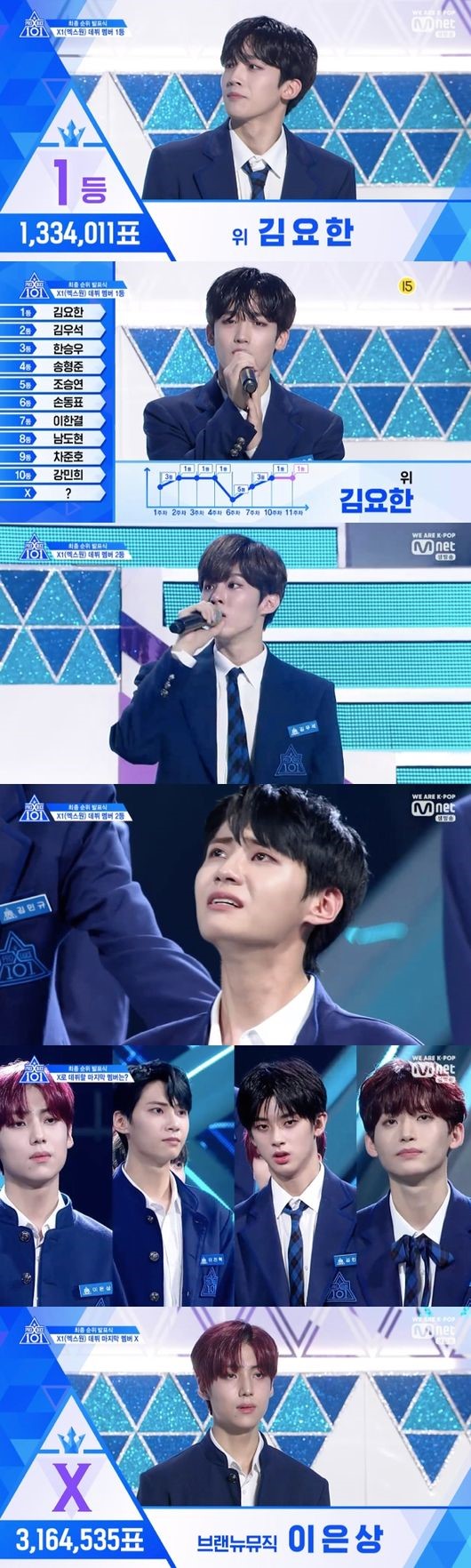 지난 19일 방송된 '프로듀스X101'에서 20명의 연습생 들 가운데 11명이 엑스원 데뷔 멤버로 뽑혔다. 국민 프로듀서들의 문자 투표로 순위가 만들어졌는데 센터 김요한을 필두로 김우석, 한승우, 송형준, 조승연, 손동표, 이한결, 남도현, 차준호, 강민희, 이은상이 꿈을 이룰 기회를 얻었다.