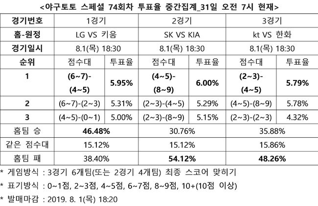 이번 야구토토 스페셜 74회차 게임은 경기 시작 10분 전인 오는 8월 1일 오후 6시 20분 발매가 마감되며, 경기가 모두 종료된 후에 적중결과가 공식 발표된다.