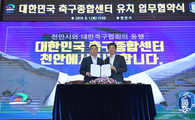대한축구협회와 천안시는 1일 천안시청 대회의실에서 축구종합센터 유지 업무협약식을 개최했다. 이날 협약식에는 정몽규 대한축구협회 회장과 구본영 천안시장이 참석했다.