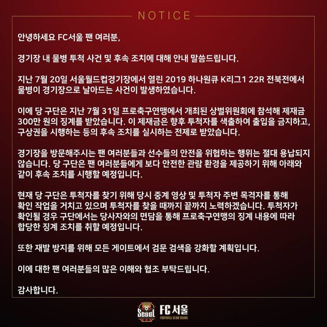 서울은 1일 SNS를 통해 "경기장을 방문해 주시는 팬 여러분들과 안전을 위협하는 행위는 절대 용납되지 않는다. 구단은 팬 여러분들에게 보다 안전한 관람 환경을 제공하기 위해 후속 조치를 시행할 예정"이라면서 "당시 중계 영상 및 투척자 주변 목격자를 통해 확인 작업을 하고 있다. 끝까지 투척차를 찾을 예정이다. 투척자가 확인될 경우 구단에서는 당사자와 면담을 통해 연맹의 징계 내용에 따라 합당한 징계 조치를 취할 예정이다. 또한 재발 방지를 위해 모든 게이트에서 검문 검색을 강화할 계획"이라고 전했다. / 10bird@osen.co.kr