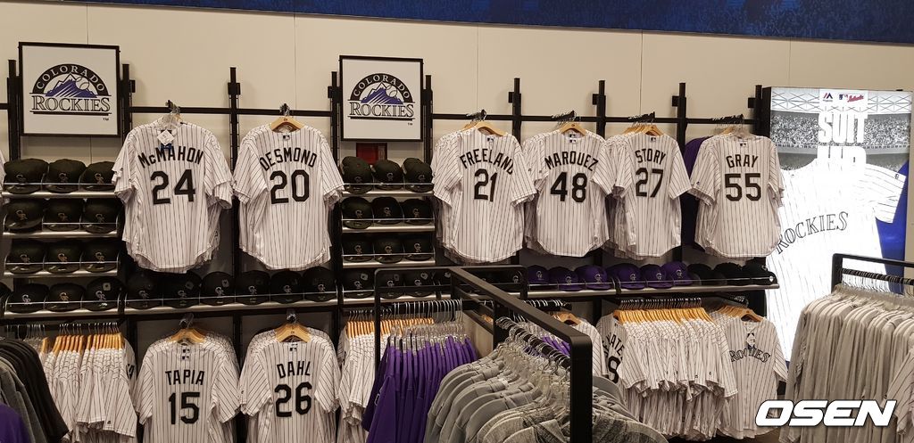 1일(한국시간) 미국 덴버 쿠어스필드의 콜로라도 구단 메인 스토어. 콜로라도 구단 관련 상품, 선수들 유니폼, 각종 액세서리 등이 잔뜩 진열돼 있었다. 보라색 콜로라도 모자를 쓴 팬들은 팀 간판 스타인 놀란 아레나도를 비롯해 찰리 블랙몬 등 선수 유니폼 등을 고르느라 분주했다.