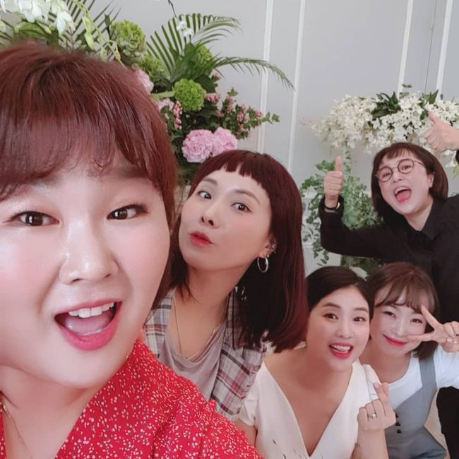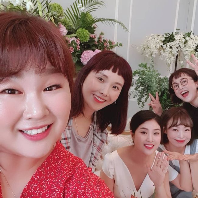 공개된 사진 속에는 웨딩드레스를 입은 강유미와 결혼식을 축하해주기 위해 참석한 송은이, 신봉선, 김민경, 오나미의 모습이 담겨 있다.