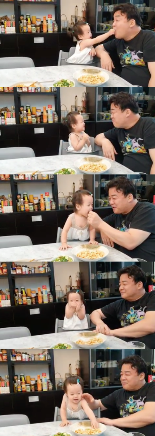 동영상 속에서 백종원과 막내 딸 세은이 테이블에 앉아 있는 모습. 딸이 백종원에게 과자를 먹여주고 좋아하고 백종원이 그런 딸을 보며 흐뭇한 미소를 짓고 있다.