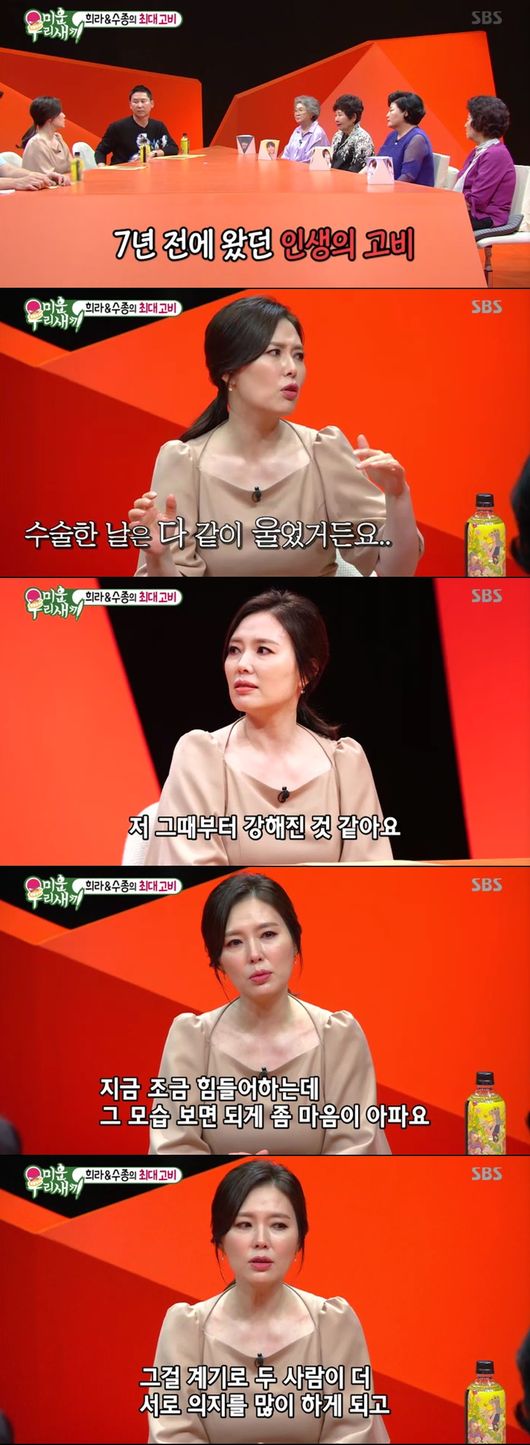 무엇보다 하희라는 7년 전 큰 사고를 당했던 최수종을 언급 "처음엔 대소변도 받아, 나중엔 천천히 움직였다"면서 "난생처음 본 아파하는 남편의 모습, 수술한 날 다같이 울었다"며 회상했다. 하희라는 "대장부라고 하지 않았냐, 그때부터 강해졌다, 언제까지나 남편에게 보호받는게 아니라 언젠간 남편을 보호해줘야 할때 생각했다"면서 "스스로 강해지려고 노력했다"며 아무도 모르게 마음고생했던 과거를 전해 먹먹하게 했다.