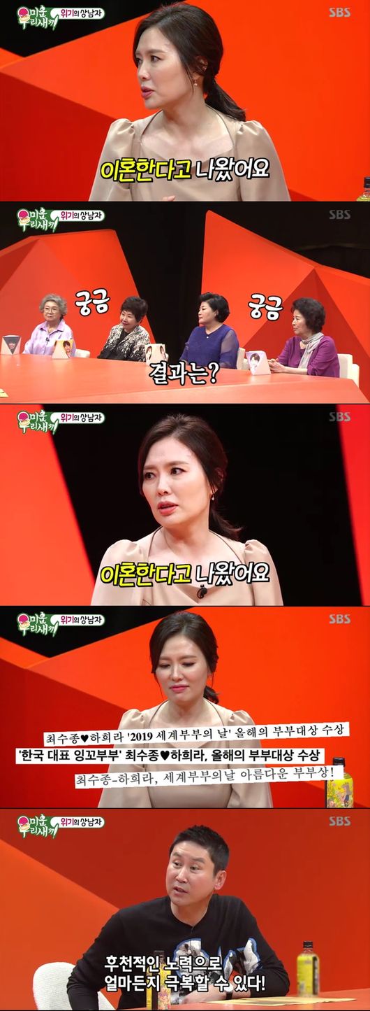 이를 본 MC들은 게스트 하희라도 남편 최수종과 결혼 전에 궁합을 봤는지 질문, 하희라는 "어른들이 봤다, 이혼한다고 나왔다, 세 번 봤는데 마지막 간 점집에서도 1년 안에 이혼 한다더라"고 대답했다. 서장훈은 "사주 궁합에 신뢰도를 급격하게 떨어뜨린다, 잉꼬부부로 대상수상했는데"라며 놀라워했다. 신동엽은 "후천적인 노력으로 얼마든지 극복할 수 있어, 통계일 뿐이다"고 정리했다.
