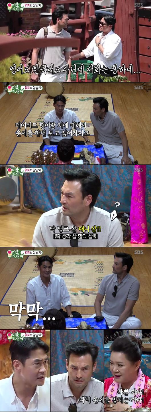 무속인은 "데이비드 처음 봤을 때 살이 많구나 느껴, 빨리 없애줘야겠다 생각했다"고 했다. 하지만 '살'에 대해 제대로 알지 못하는 데이비드에게 이를 제대로 통역하지 못해 웃음을 안겼다. 급기야 데이비드는 "쌀? 밥?"이라 말해 폭소하게 했다. 무속인은 "나쁜 운세"라고 차근히 설명, 배정남도 "베드 럭키"라고 가까스로 통역했다.