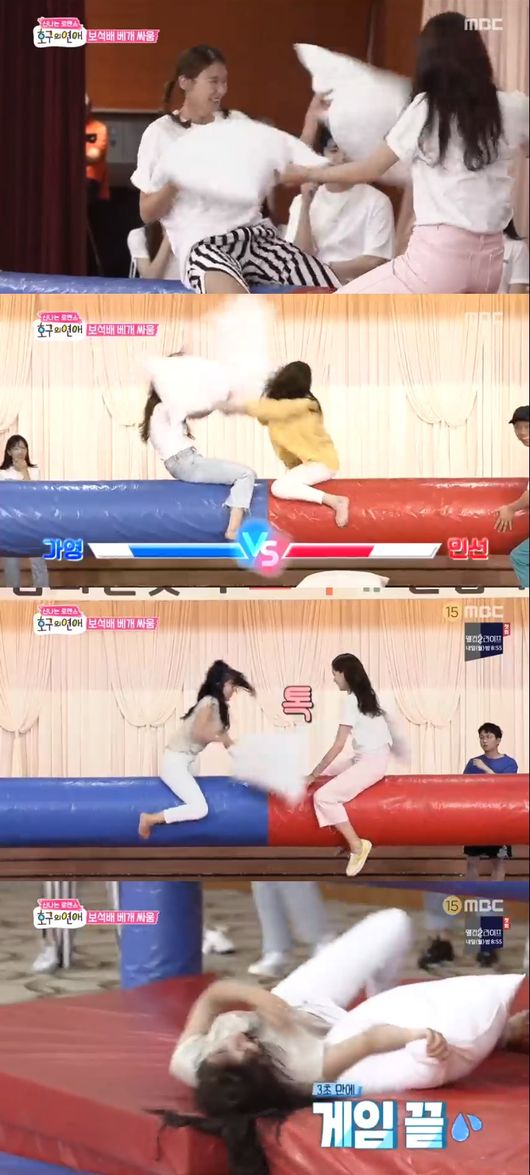 이날 유인영은 외나무 다리에 오르자마자 선방을 날리며 홍선영을 제압했다. 이후에도 계속되는 일방적인 공격을 하지만 아쉽게 패했고, 홍선영이 숭리를 거머쥐었다. 이어지는 경기는 가영과 민선. 두사람은 기필코 이기리라는 전투력으로 남자들 못지 않은 긴 베개싸움을 이어갔고 결국 가영이 승리를 차지했다.