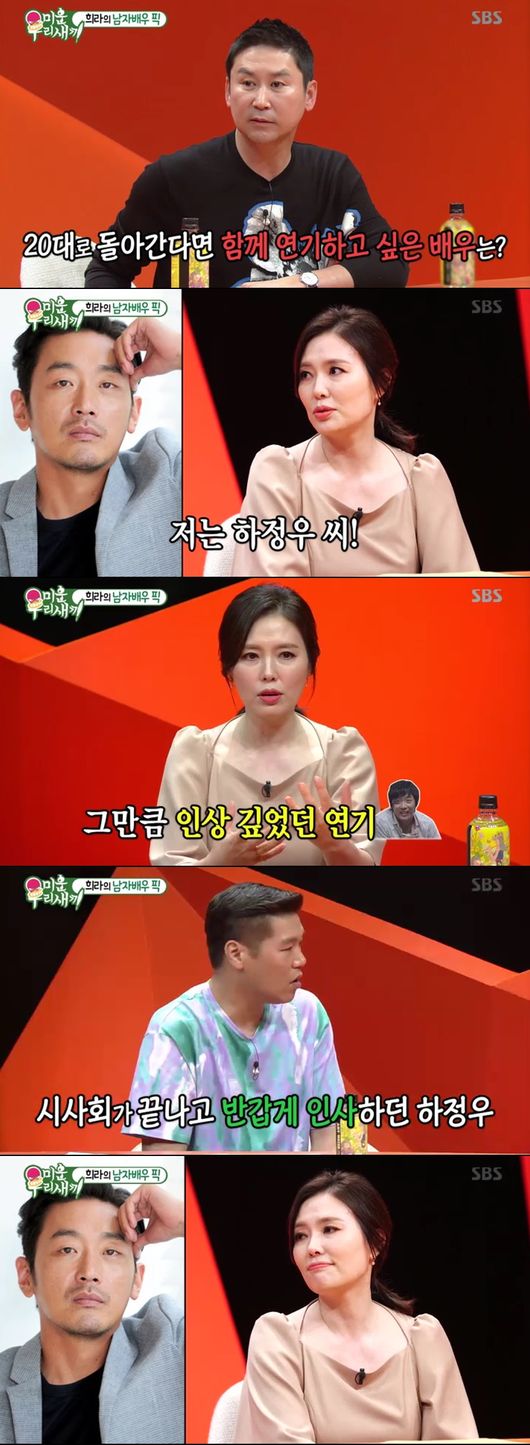 또한 하히라는 20대로 돌아간다면 함께 연기하고 싶은 배우로 하정우를 꼽았다.하희라는 "가장 매력적인 배우, 정말 연기 잘한다"면서 "사실 미안한 일 있다, 영화 '추격자' 출연 때 시사회 갔다가 너무 무서웠다, 시사회 끝나고 반갑게 인사했는데 눈도 안 마주치고 도망갔다"며 그만큼 인상깊었던 연기로 에피소드를 전했다. 하희라는 "같이 한번 연기하고 싶다"고 덧붙였다.