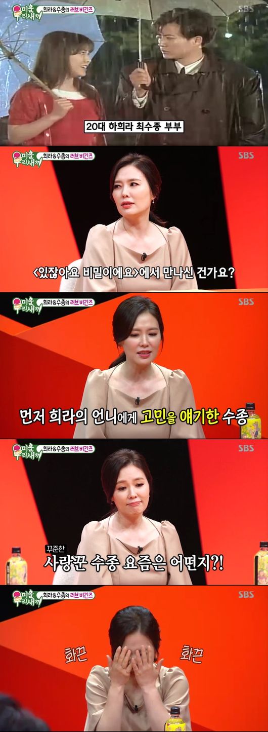 또한 남편 최수종과는 1990년도 영화 '있잖아요, 비밀이에요'에 같이 출연했다는 하희라는 "87년 '젊음의 행진'에서 처음 만났다"면서 "이 사람을 정말 좋아하는지 감정이 든 건 대학교 4학년 때부터, 그 전까진 친 오빠처럼 늘 챙겨주던 존재, 엄마도 아들처럼 생각했다"고 했다. 그러면서 "고백을 나에게 먼저 하지 않았다, 저희 언니한테 먼저 조심스럽게 고백시기를 물어봐, 졸업할 때까지 기다리라고 수종에게 천금같은 조언을 해줬다"고 해 눈길을 끌었다.