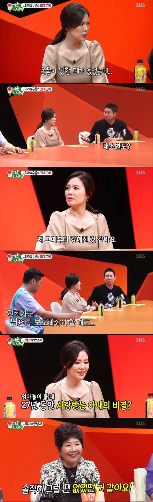 하희라는 "대소변 다 가려줬던 시간, 늘 건강하던 남편이 몸도 제대로 못 움직이고 있을 때 인생 최대고비였다"면서 7년 전 얘기를 꺼내면서 "나중엔 천천히 움직였다, 난생처음 본 아파하는 남편의 모습, 수술한 날 다같이 울었다"며 회상했다. 하희라는 "대장부라고 하지 않았냐, 그때부터 강해졌다, 언제까지나 남편에게 보호받는게 아니라 언젠간 남편을 보호해줘야 할때 생각했다"면서 "스스로 강해지려고 노력했다"며 아무도 모르게 마음고생했던 과거를 전했다.