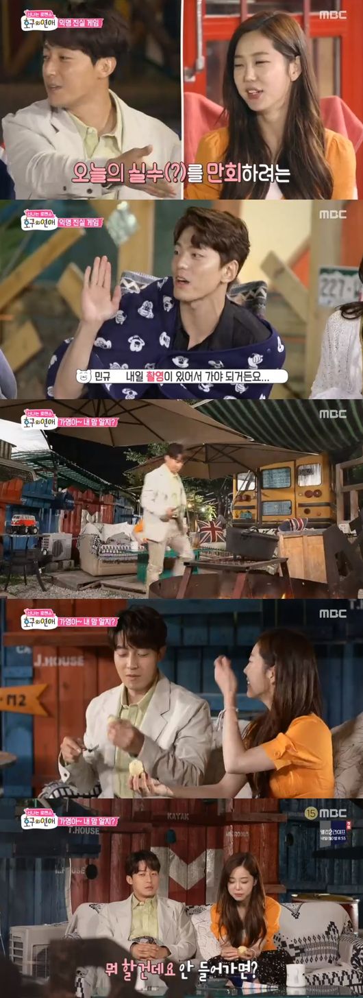 뒤늦게 합류한 민규는 "지안이 보고 싶어서 왔다. 그런데 다시 가봐야한다"며 솔직하게 마음을 표현한 후 자연스럽게 채지안 옆에 앉았다. 이 두 사람의 모습을 본 시경은 씁쓸해했지만, 아내 자신이 획득한 보석을 채지안에게 주면서 민규를 자극했다. 이후 나머지 회원들은 모두 숙소로 들어갔고, 경환은 "수습할 게 있다. 이대로 못 들어간다"며가영과 시간을 보냈다. 민규 역시 다시 촬영장으로 돌아가야 하기 때문에 지안과 함께할 시간이 별로 없었던 것.회원들의 동의를 얻어 오붓한 둘만의 시간을 가졌다. 경환은 가영에게 "강원도에서 유명한 게 뭔지 아느냐. 바로 옥수수와 감자다"라며 찐 감자를 주면서 "둘이 있으니까 너무 좋다, 숙소 안들어가도 되지 않냐. 6시에 몰래 들어가면 된다"라며 밤 새고 놀자고 제안했다. 이에 가영은 수줍게 고개를 저었다.