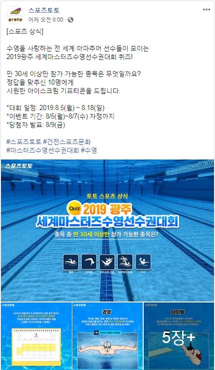체육진흥투표권 스포츠토토의 수탁사업자인 ㈜케이토토가 공식 페이스북을 통해 오는 7일(수) 자정까지 2019광주 세계마스터즈 수영선수권대회에서 만 30세 이상만 참여할 수 있는 종목을 맞히는 ‘토토 스포츠 상식’ 이벤트를 실시한다고 밝혔다.