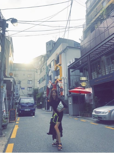 사진에서 박솔미는 한적한 거리를 배경으로 카메라를 향해 활짝 웃고 있다. 영화 필름 같은 필터 처리가 화보를 연상케 한다. 무엇보다 박솔미의 늘씬한 보디라인이 인상적이다.