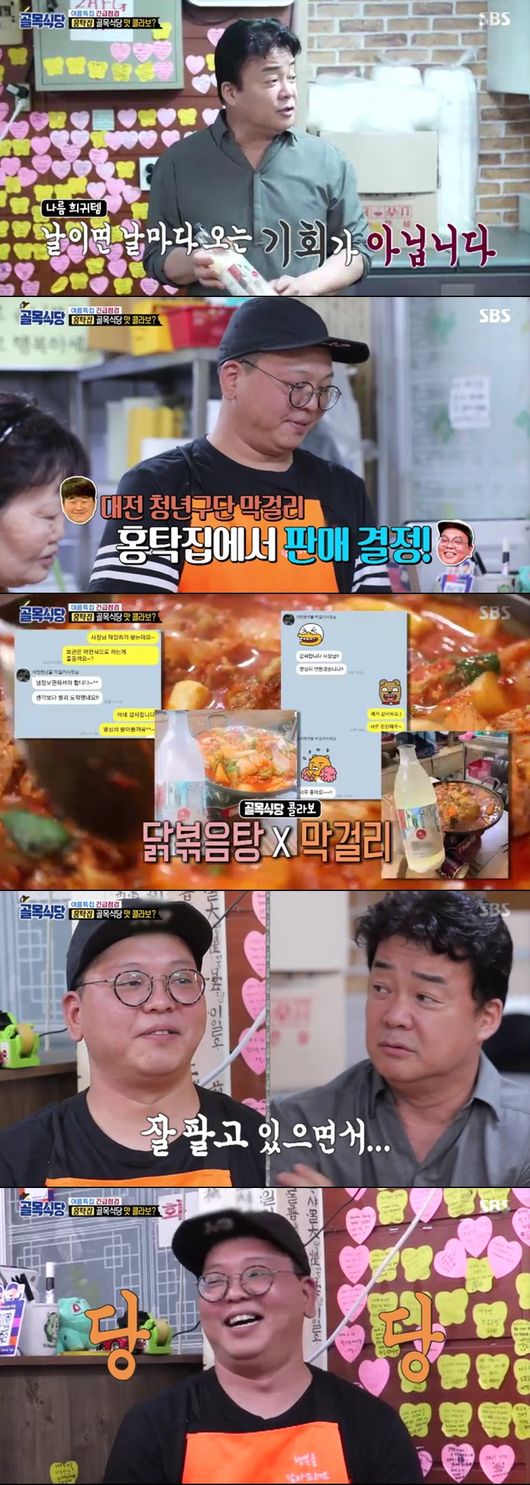 백종원이 홍탁집을 다시 찾아갔다. 대전 청년구단 막걸리를 선물로 가져온 것이다. 골목식당끼리 매칭되는 훈훈함이 그려졌다. 백종원은 "서로 돕고 도와라"며 후배들을 챙겼다.