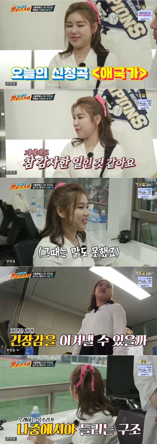 8일 방송된 TV조선 예능 '송가인이 간다- 뽕따러가세' 송가인은 야구장 첫 나들이에서 애국가를 완창했다.