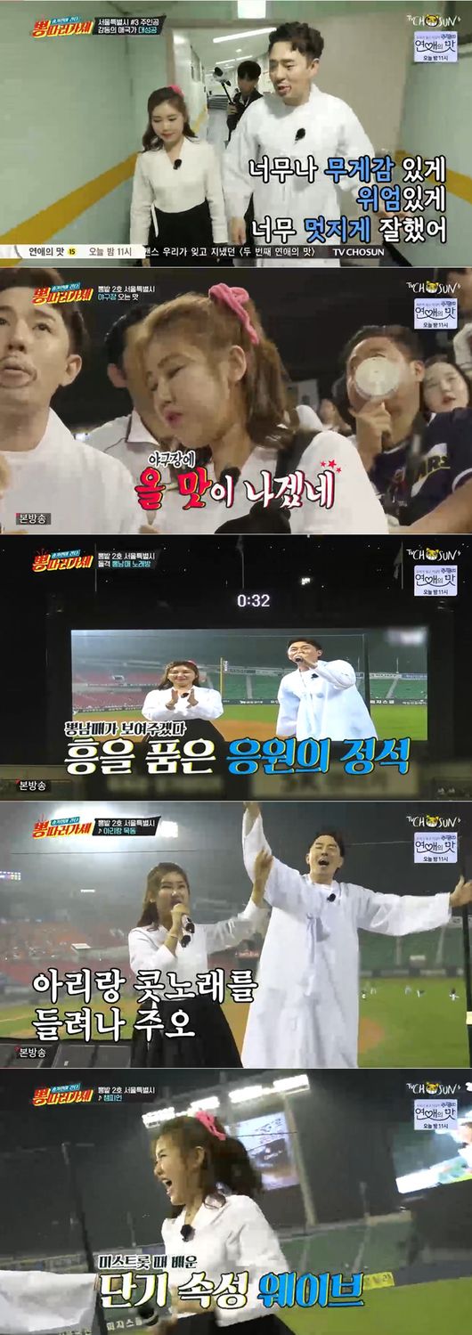 감동의 애국가를 대성공해서 부른 송가인을 보며 모두가 환호했다. 모두 엄지를 세울 정도였다. 붐은 "무게감과 위엄있게, 멋지게 정말 잘 했다"며 극찬했다. 이어 응원석에서 함께 합류해 흥을 충전전했다.댄스 삼매경에 빠진 두 사람에게 갑작스럽게 응원단장의 공연제의까지 받았다. 막간을 이용한 뽕남매의 특별한 공연이 펼쳐진 것이다. 뽕남매가 돌격했고, 노련한 무대매너와 춤실력으로 관중들을 들석이게 했다. 더욱 경기장을 환호하게 한 뽕남매 케미였다. 애국가에 이어 깜짝 응원단 공연까지 성공리에 마쳤다.