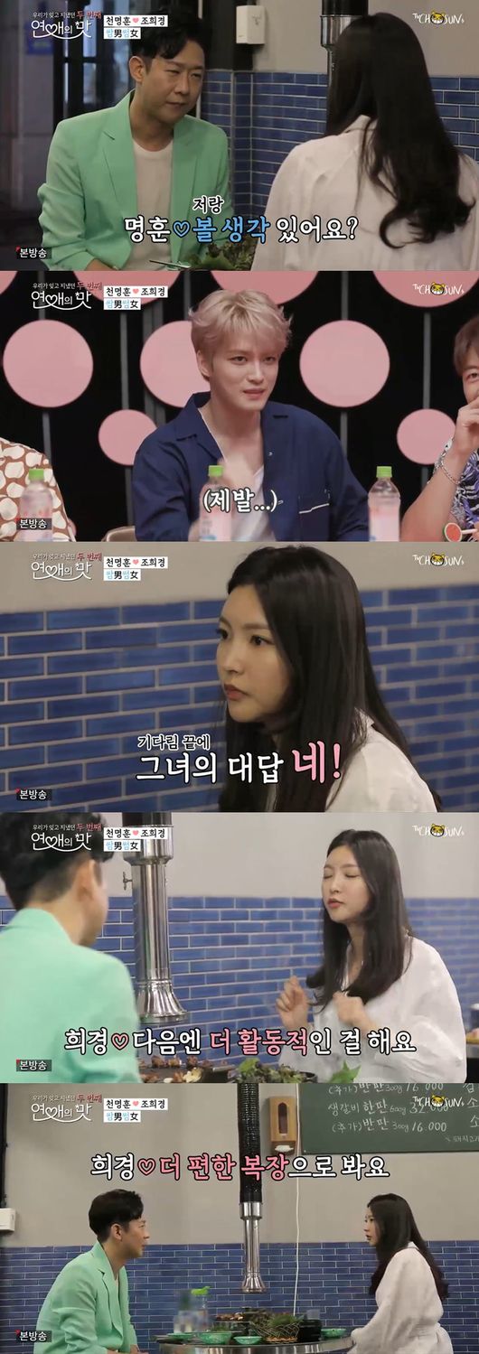 MC들은 "연애 그린라이트, 호감이 있다는 것"이라며 안심했다. 천명훈은 "어떤 분이 나타나든 진정성을 전하고 싶었다, 상대에게 보여드리고 싶은 걸 준비했다"면서 진심을 담아 노력했다고 했다. 그러면서 바로 이상형을 물었고, 희경은 공룡상이라며 김우빈을 꼽았다. 이어 성격에 대해선 "진지한 분은 별로 안 좋아한다"고 하자, 천명훈은 "내가 진지가 없다"고 말해 웃음을 자아냈다.