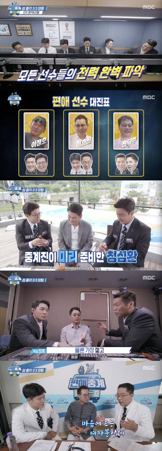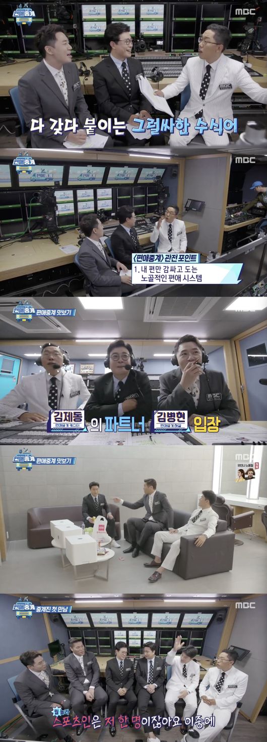 지난 9일 방송된 MBC 새 파일럿 예능 프로그램 '편애중계'에서는 서장훈과 붐, 안정환과 김성주, 김병현과 김제동으로 이뤄진 세 편애중계진이 섬총각 3인방의 미팅을 중계하는 모습이 그려졌다.