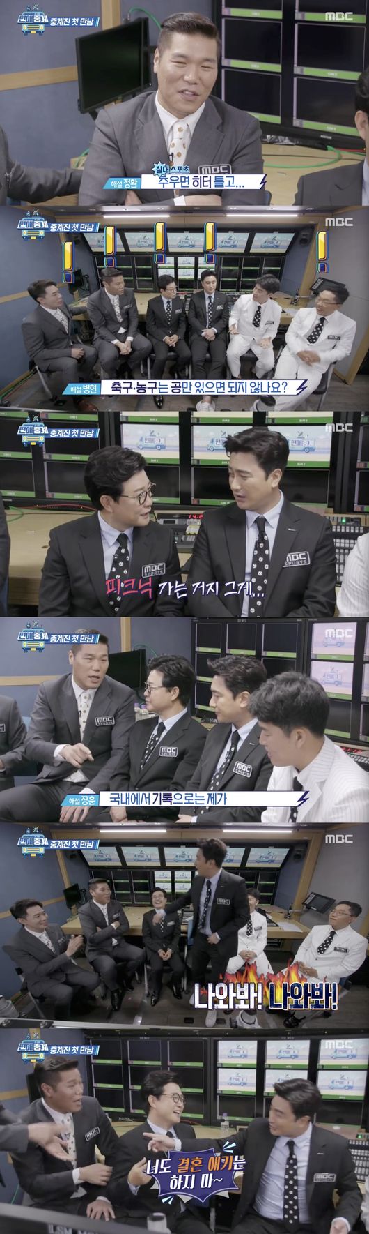 캐스터들과 만나 여섯 명이 한 자리에 모여서도 스포츠 스타들 간의 신경전은 계속됐다. 김병현은 서장훈에게 국내파라고 도발했고 안정환은 "농구는 실내 스포츠 아니냐. 더우면 에어컨 틀고 추우면 히터 틀고 한다"고 덧붙였다.