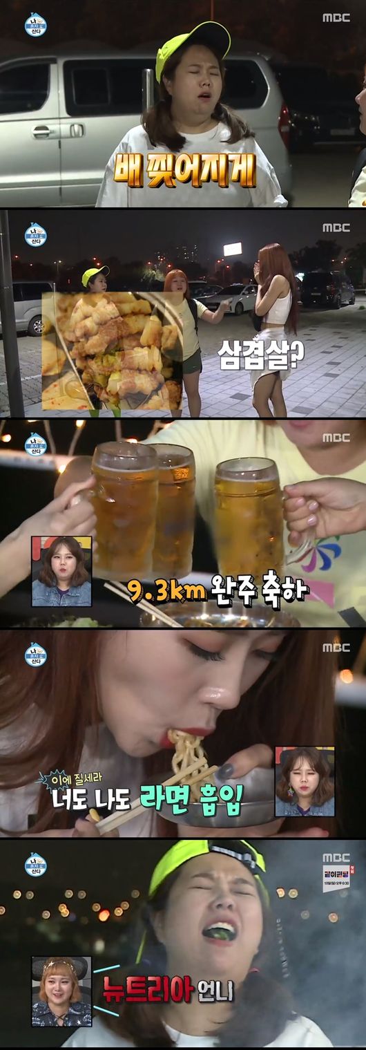 9일 방송된 MBC 예능프로그램 '나 혼자 산다'에서는 박나래, 홍현희, 미주가 서울 걷기 운동 후 삼겹살, 치킨 먹방을 선보였다.