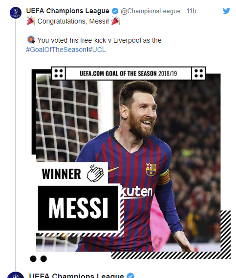 메시는 스페인 바르셀로나 캄프 누에서 열린 UCL 4강 리버풀과 1차전서 선보인 환상적인 프리킥 득점으로 웹사이트 투표서 전체 1위를 차지했다.