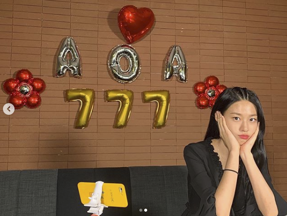 함께 올린 사진에서 설현은 AOA, 777 풍선을 배경으로 브이 라인을 뽐내며 귀여운 표정을 짓고 있다. AOA 데뷔 7주년을 기념한 이벤트 자리.