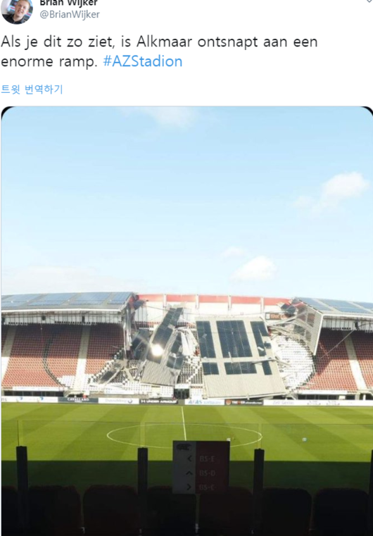미국 '블리처 리포트'는 11일(한국시간) "강풍으로 인해 네덜란드 예례디비지 AZ 알크마르의 AFAS 스타디움의 지붕이 부분 붕괴됐다"라고 보도했다.