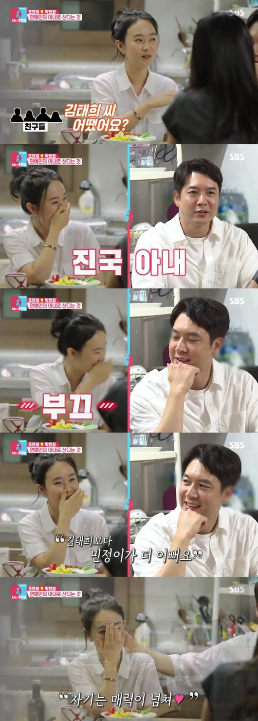 또한 시누이가 "예쁜 여배우와 남편 애정씬 보면 어떠냐"고 물었다. 최고 여배우들과 키스신을 했던 조현재에게 박민정은 "보고 오빠한테 더 찐하게 했어야한다고 말했다"면서 "남편 촬영장 갈 때 매일 나만 보니 안구정화하고 오라고 한다"며 쿨내넘치는 모습을 보였다. 박민정은 "어차피 넘사벽이 많으니 흔들리면 나만 힘들다"면서 연예인의 아내로 산다는 고충을 전했다.