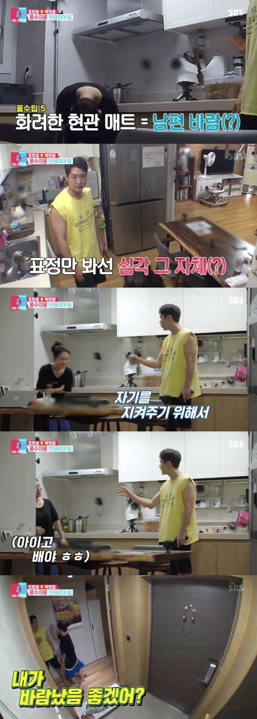 조현재는 꿋굿하게 "소파 뒤에 풍경화가 있으면 일이 잘 된다더라"면서 꿋꿋한 모습을 보였으나 아내는 반대했다. 조현재는 "심신의 안정이 된다"며 지지 않았다. 게다가 아내가 무지개 매트를 현관에 놓고 싶다고 하자, 조현재는 "화려한 현관 매트는 남편이 바람난다고 한다, 자기를 지켜주기 위해서"라고 했다. 아내는 "그놈의 바람같은 소리하고 있다, 화사한 느낌나서 들어왔으면 좋겠다"며 아쉬워했다. 조현재는 "내가 바람 났으면 좋겠냐"고 말해 웃음을 안겼다.