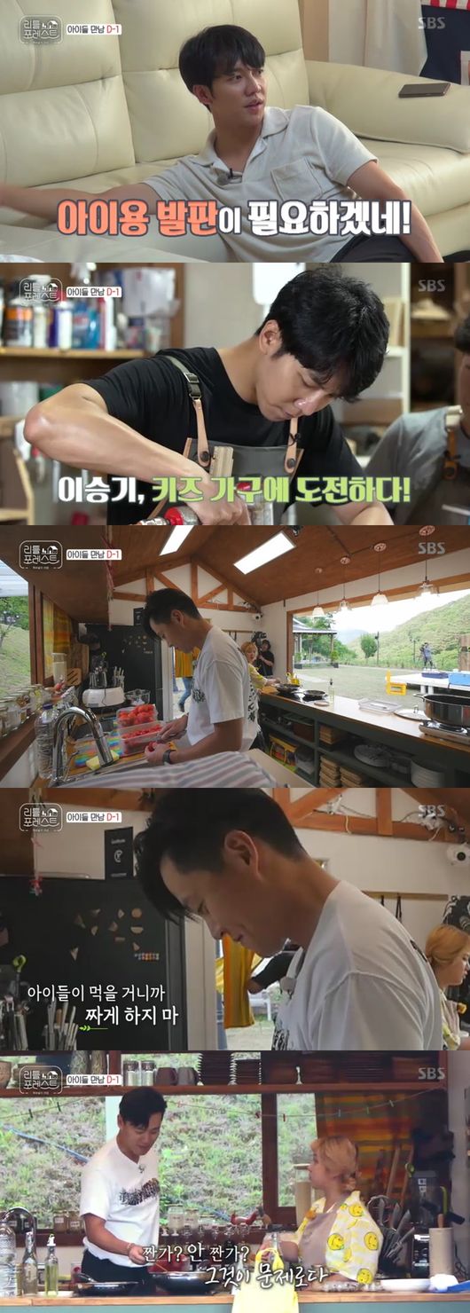 이승기는 남성미를 뿜으며 목공에 열중했다. 앞서 친구네에서 육아 예습을 하는 동안 느꼈던 목욕 받침대를 만들려고 했던 것이다. 그리곤 저녁이 되어 구슬땀이 담긴 아이용 발판이 완성됐다.