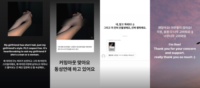 계속해서 추측성 기사와 글, 영상 올리면 법적으로 처분하겠습니다. 내가 사랑해서 당당하게 잘못이 아니니까 커밍아웃 한 것이지만 사람들한테 눈에 띄고자 커밍아웃을 한 게 아니에요. 어느 누가 커밍아웃을 그렇게 가벼운 생각으로 하나요.