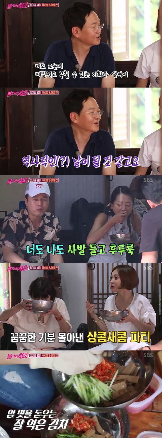 이어 최성국과 나란히 앉아서 메밀전 부치기에 도전했다. 그 사이, 친구들은 장마철 별미인 도토리 묵사발까지 완성했다. 식사에 앞서 김민우는 "비도 오는데 메밀전도 부치고 역사적인 날이 될 것 같다"면서 "환영해주셔서 감사하다"고 인사했다. 덕분에 더욱 맛있는 식사를 즐겼다.