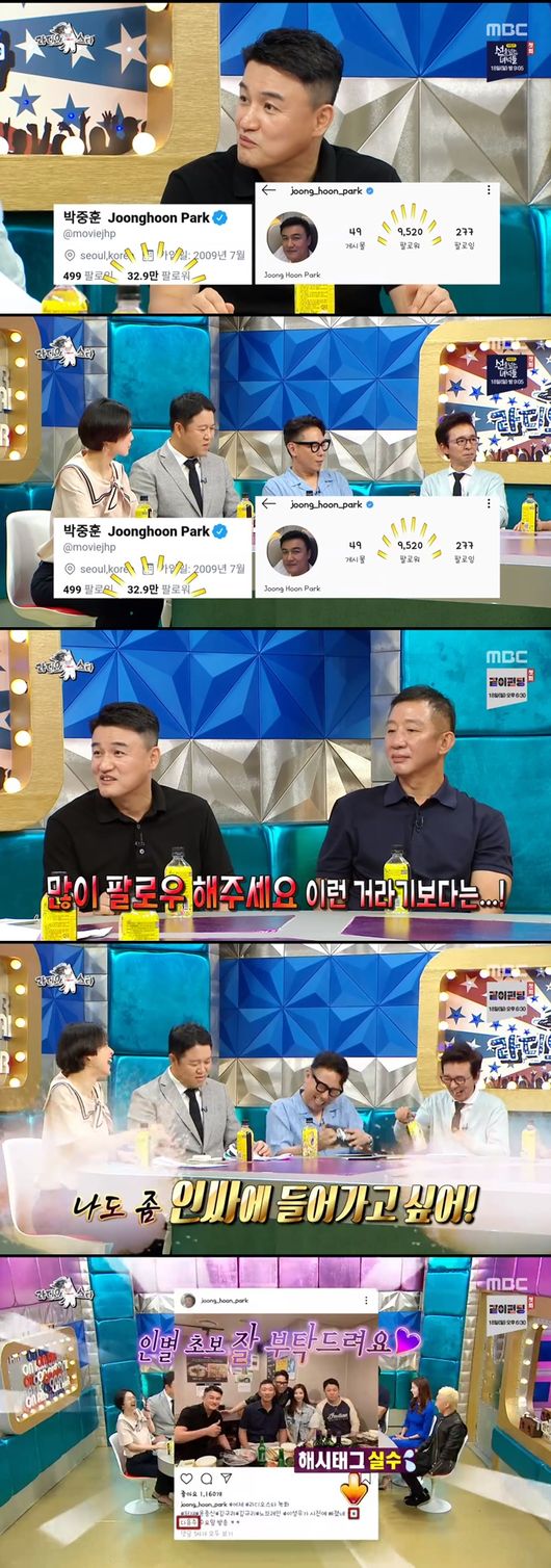 한편, 이날 박중훈은 "최근에 인스타그램을 시작했다"며 "열심히 했는데 팔로워 만 명이 안 넘는다. 나도 열심히 해서 인싸에 들어가고 싶다"고 말해 웃음을 자아냈다.