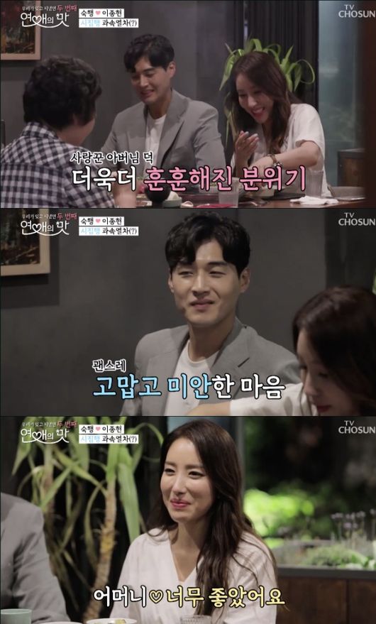 '연애의 맛 시즌2'의 숙행, 이종현 커플의 관계가 급격한 진전을 보였다. '내일은 미스트롯' 동생들의 "형부" 소리부터, 이종현의 부모와 숙행 부모의 통화까지 일사천리로 이뤄졌다.
