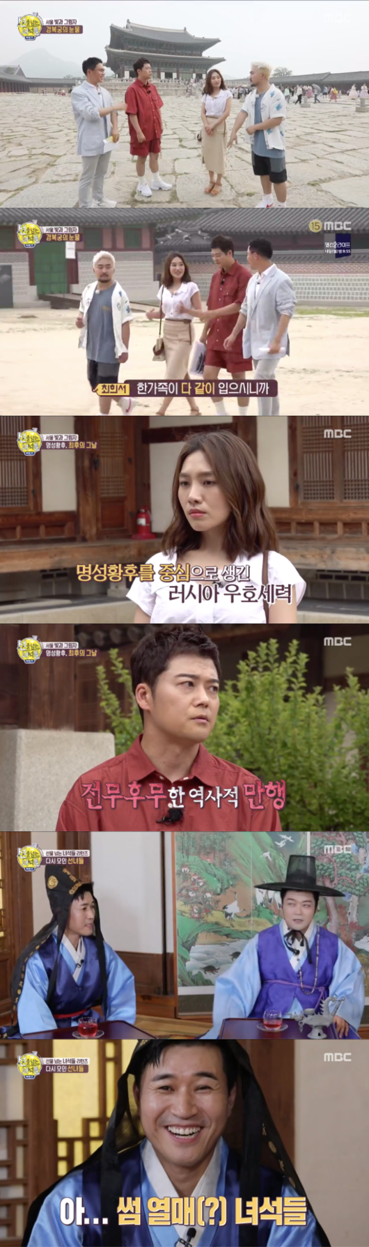 뿐만 아니라 멤버들은 일제강점기 수많은 수난을 겪었던 경복궁의 역사에 대해 들으며 충격과 분노에 휩싸이기도 했다. 특히 설민석이 경복궁 근정전에 걸린 일장기 사진을 보여주자 “남의 집 안방에서 이게 무슨 일이냐”며 안타까운 마음을 표현하기도 했다. 당시 일본 제국주의의 상징인 조선물산 공진회로, 조선인들의 정신을 흔들기 위해 최대한 많은 이들에게 이를 보여주려했다는 설명이었다.