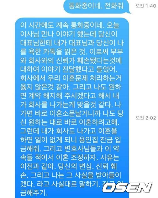 이와 함께 구혜선은 안재현에게 보낸 또 다른 문자 메시지를 공개했다. 해당 메시지에는 '대표님에게 내가 대표님과 당신이 나를 욕한 카톡을 읽은 것. 이로써 부부와 회사와 신뢰가 훼손됐다는 것에 대해 이야기 전달했다고 들었다' '회사에서 우리 이혼 문제 처리하는 것 옳지 않다고 생각한다. 원하면 계약 해지해 주시겠다고 해서 내가 회사를 나가는 게 맞는 것 같다' 등의 내용이 담겨 있다.